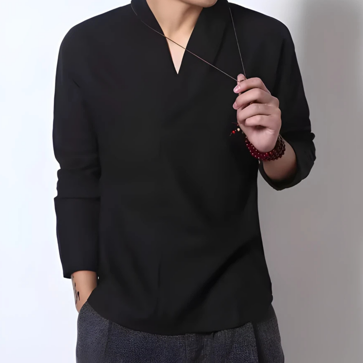 - Diseño: Escote en V pronunciado con cuello estilo mandarín